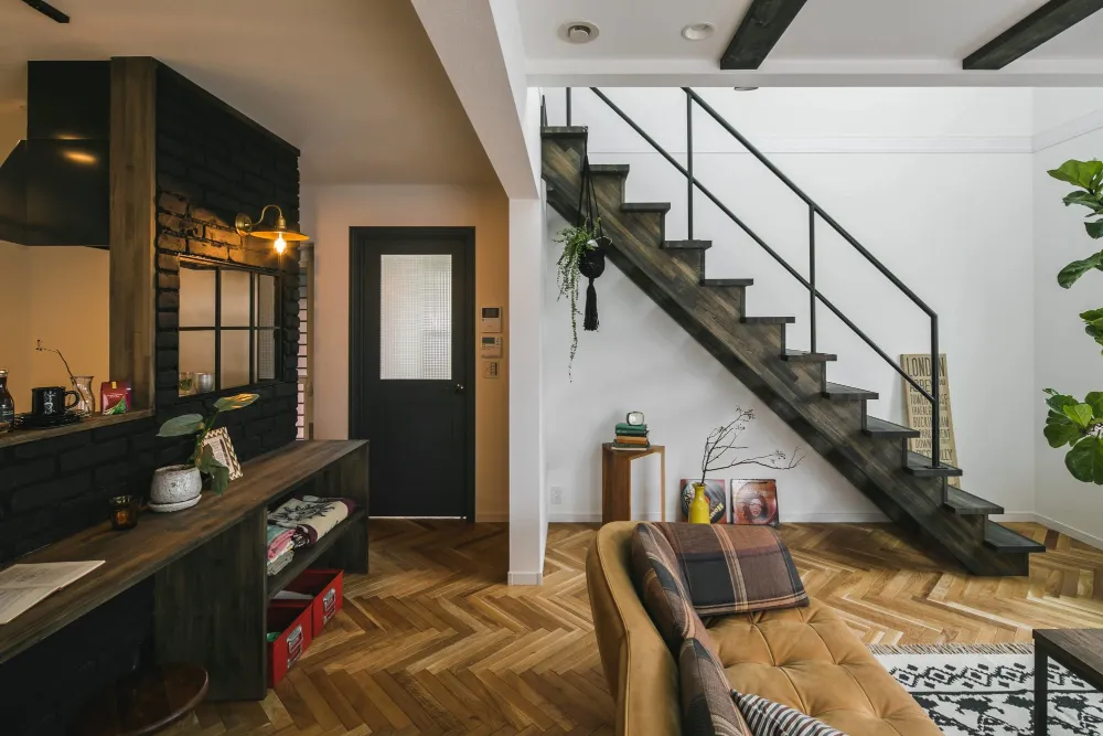 足元から個性が光る「ヘリンボーンの床」 クラシックで高級感のあるヘリンボーン床が、空間全体にリズムと上質なヴィンテージ感をプラス。