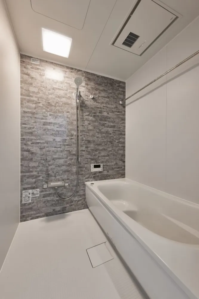 クリーンで明るいホワイト基調 浴槽、床、壁のベースを白で統一することで、清潔感を際立たせ、視覚的な広がりを生み出しています。