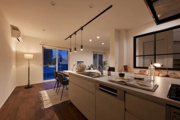 深みのあるダークウッドの床 落ち着いたトーンのフローリングが、白いキッチンや壁と美しいコントラストを描き、大人っぽくシックな印象を与えています。