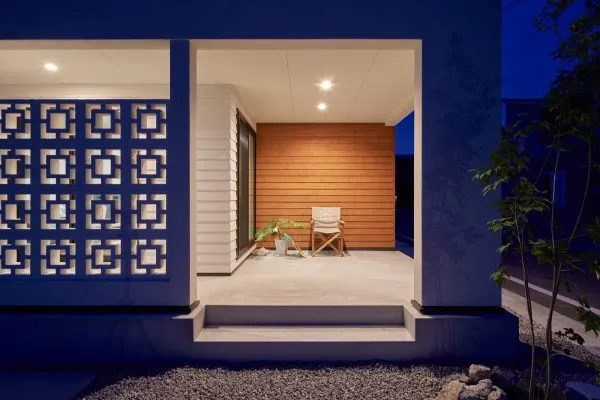 温もりを添えるウッドパネル 突き当たりの壁一面に施された木目調のパネルが、無機質になりがちな屋外スペースに温かみと上質さをプラスしています。