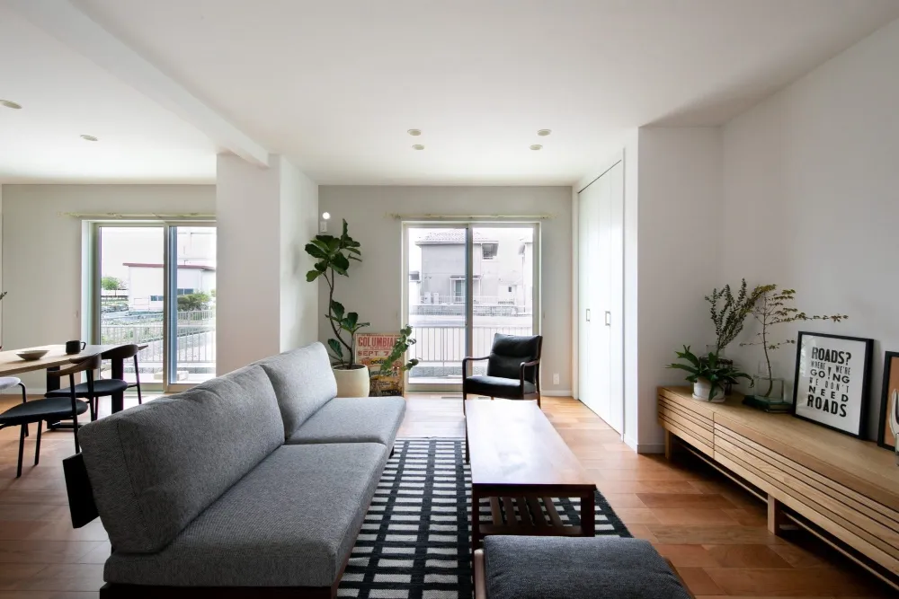 素材感が際立つナチュラルモダン ぬくもりある無垢の床材と、落ち着いたグレーのソファやアイアン調の小物が調和した、洗練された空間デザイン。