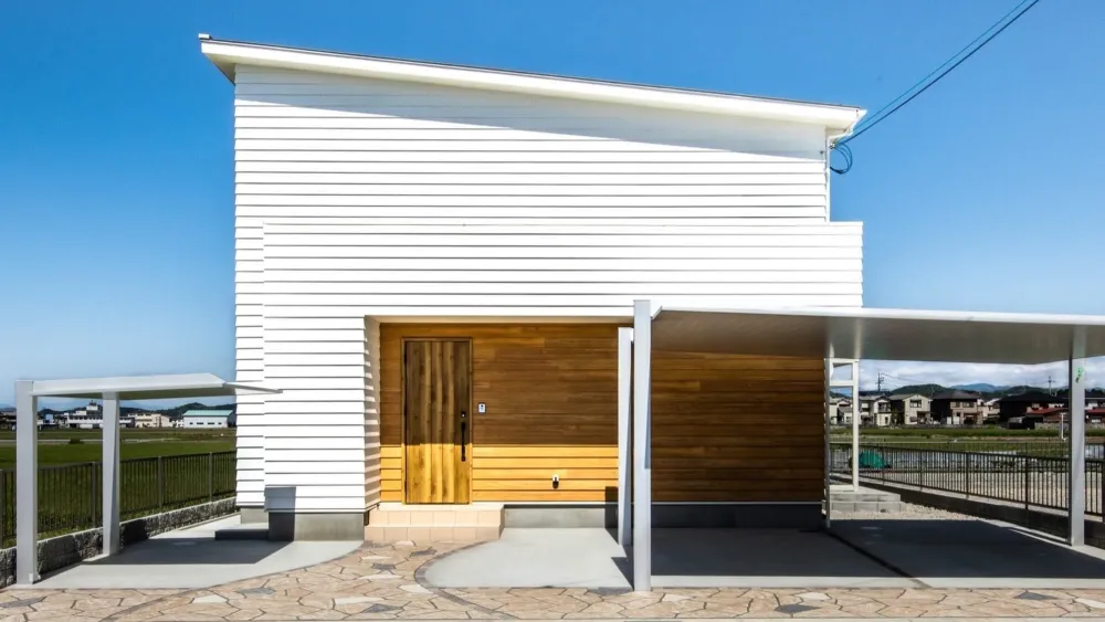 「白×木」の絶妙なバランス 清潔感のある白いラップサイディングに、天然木のアクセントが温かみを添える、洗練された外観デザイン。