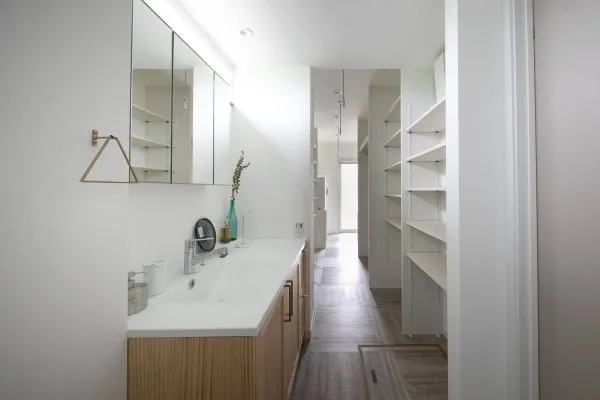 暮らしを整える「大容量のオープン収納」 洗面スペースのすぐ横に可動棚を配置。タオルや日用品をスムーズに出し入れできる、実用的な動線設計。