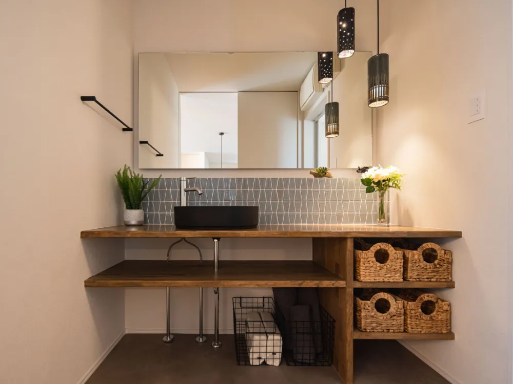 03 | タイルと陶器の照明が彩る、造作洗面台
