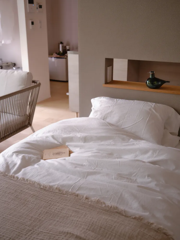 ベッド上の穴ニッチはキッチンとつながる工夫。料理や家事の合間でも、声をかけ合える距離感です。